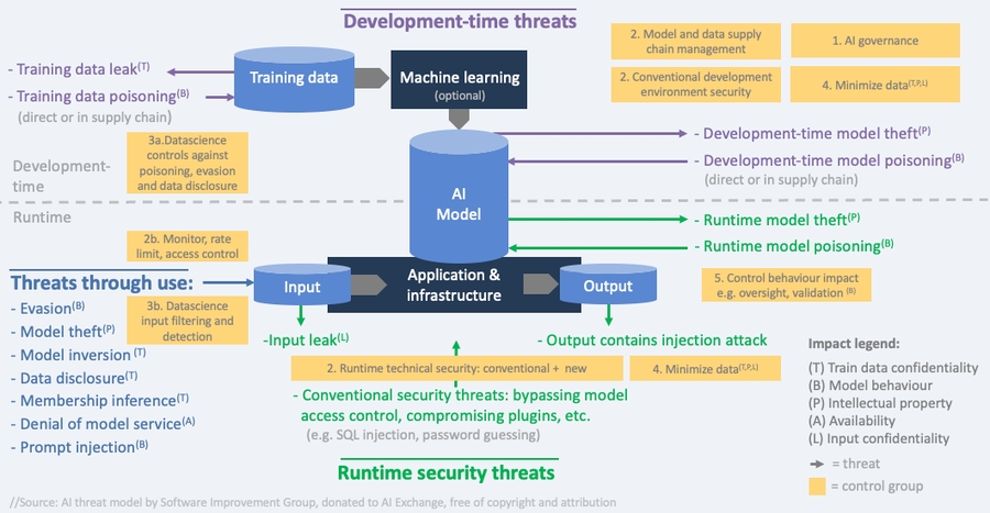 To see a general overview and discussion of all threats from different angles, check the AI threat model or the AI security matrix. In case you know the threat you need to protect against, find it in the overview of your choice and click to get more information and how to protect against it.